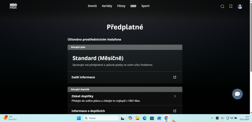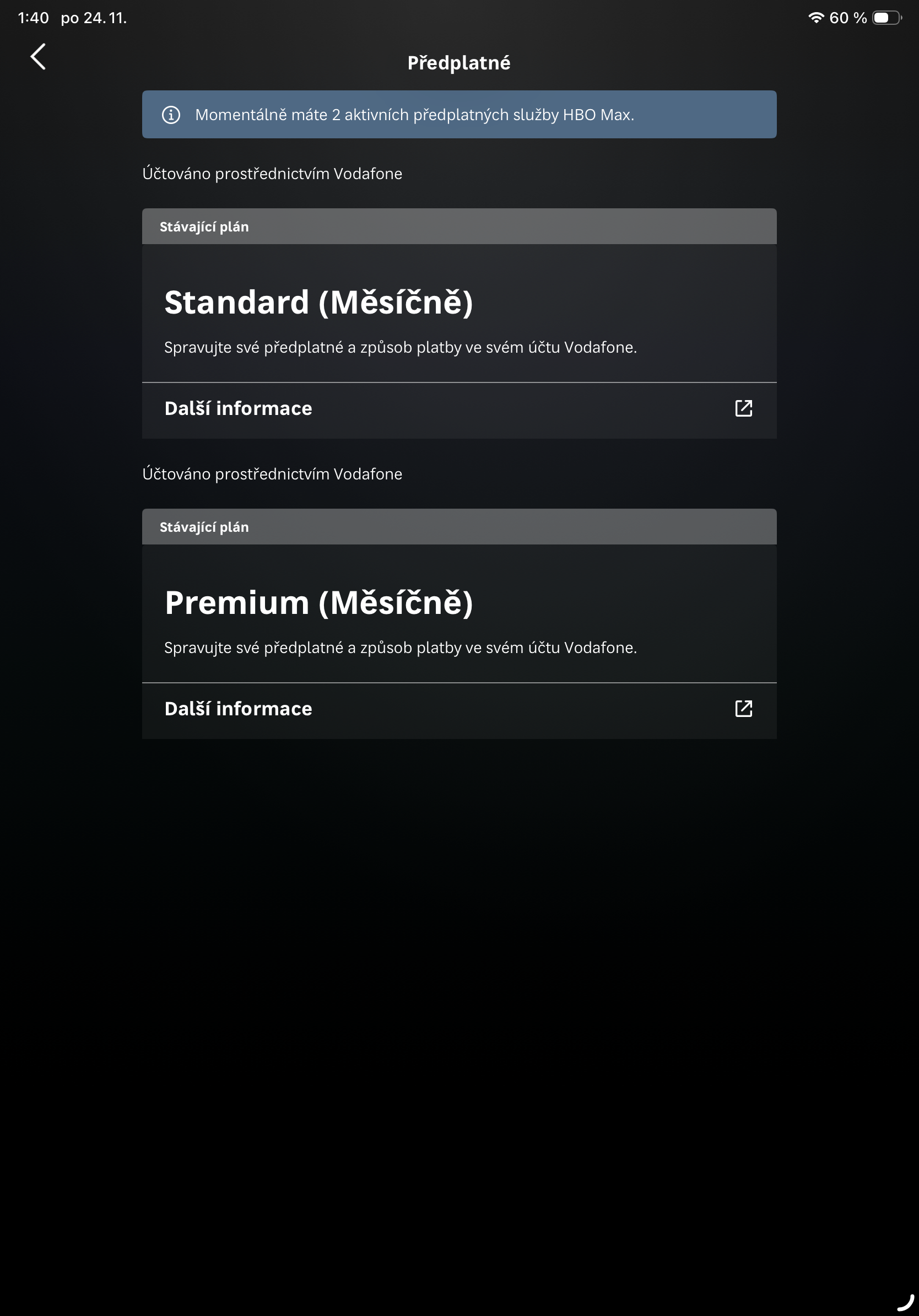HBO Max Premium0,00Kč Vaše předplatné bude obnoveno 23 prosince 2025 tak po měsíci žádná změna v aplikaci HBO pořád STANDARD .Tak načtení dalšího měsíce nepomohlo.