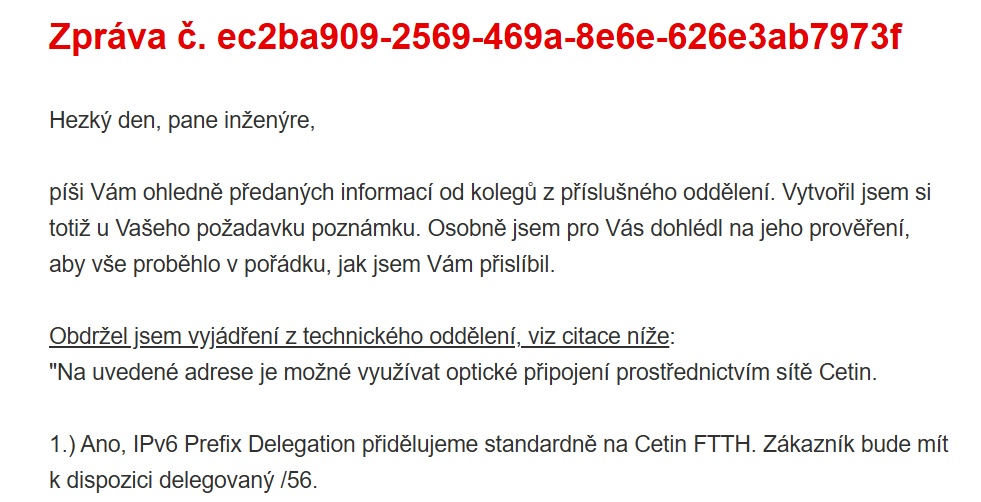 IPv4 mám, ale o tu nestojím. Služba byla zavedena s jedinou podmínkou IPv6 s PD /56, tohle mi tvrdili před objednávkou: A teď mi tvrdí, že to řešit nebudou. Bylo by to k smíchu, kdyby to nebylo k pláči. Jak asi může koncový zákazník Vodafonu řešit něco s CETINem? To je, jako kdybych výpadek proudu řešil s elektrárnou... Nebo zkažené kuře ze supermarketu reklamoval v drůbežárně...