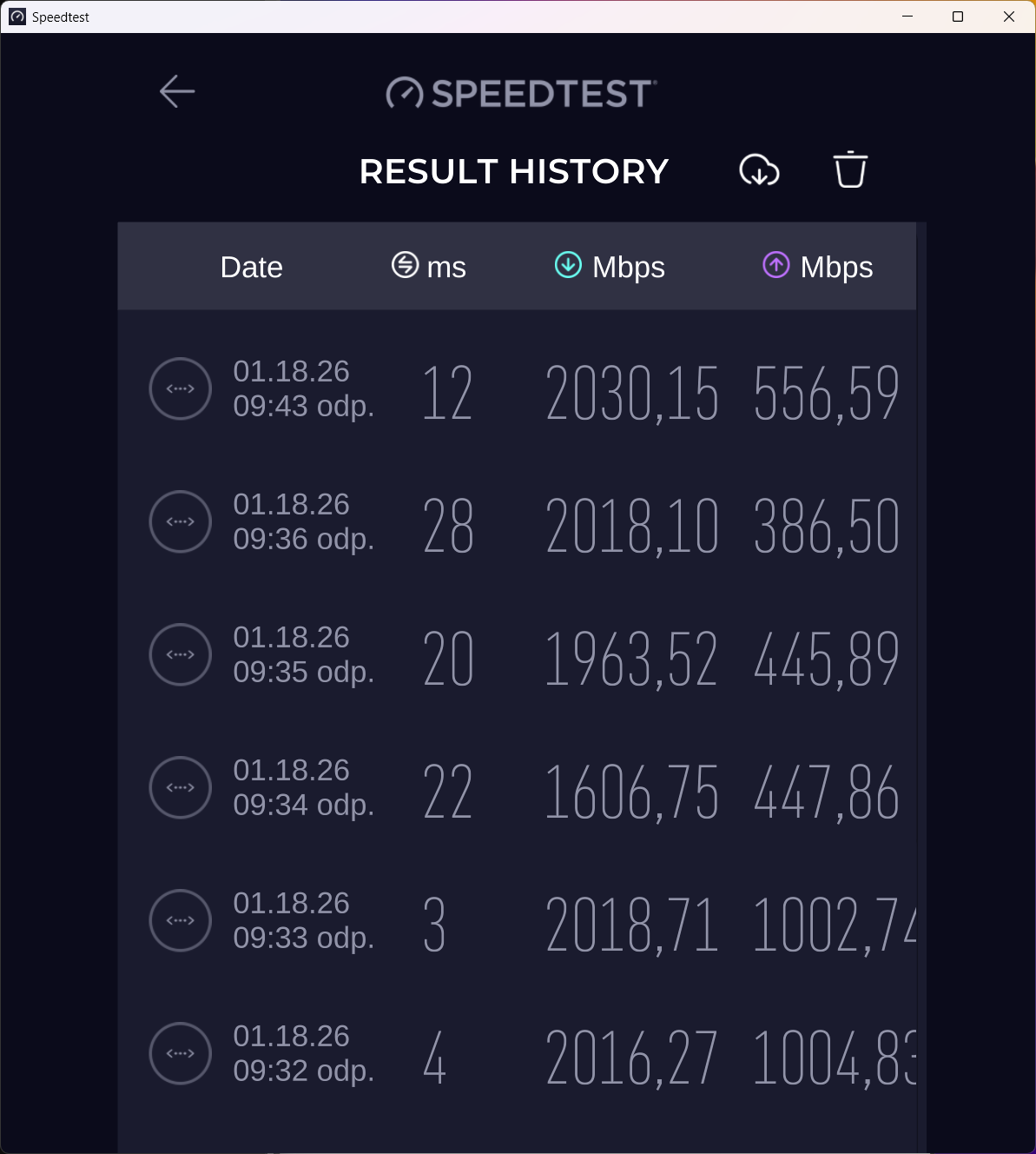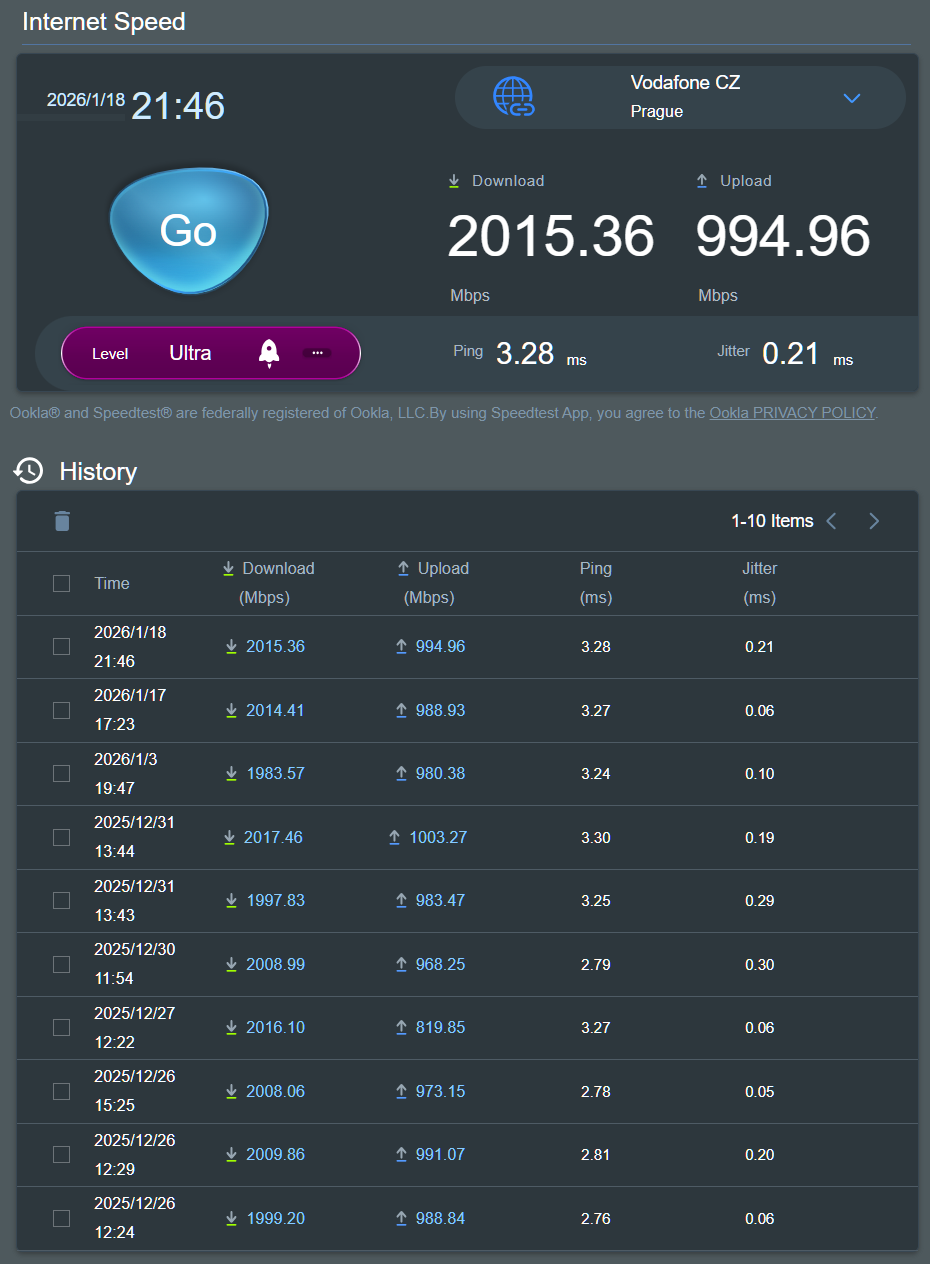 @Slamb proč ne, takto vypadá ta Cetin síť v neděli večer. Ty testy jsou DE, PL, DE, DE, Vodafone CZ, T-Mobile CZ. Download jede na 2Gbps i ze zahraničí, latence vyskočí na cca 20ms, z 3ms, a upload je na zhruba polovině, zatímco po Česku dává plný 1Gbps. A pak nějaké dlouhodobější měření přímo v routeru, ta linka je krásně stabilní: