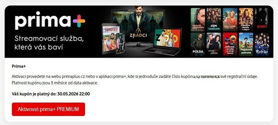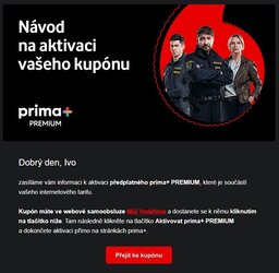 300 peněz Ale mám tu takovou zajímavou úsměvnou (tedy pro mě jo) záležitost. K tarifu dávají údajně 12 měsíců Prima+ (obrázek 1). O aktivaci mě již dopoledne informovali SMS na mobilu (po zavedení nového modemu a tarifu 1000). Já tuhle stanici moc nemusím, tak jsem na to nereagoval. Před chvílí mě přišel email (obrazek 2) Že si můžu aktivovat tu Prima+. Tož jsem tedy na to kliknul a na Můj Vodafone jsem našel kód a informaci, do kdy tu Prima+ budu mít. (obrázek 3). Tedy do konce května. A teď je otázka: Jak dlouhý je ve skutečnosti jeden rok? Dvanáct měsíců tedy podle Vodafone určitě ne. Tam slaví 12 silvestrů za jeden pozemský rok. Sakra, ti se tam mají fajn. 😄