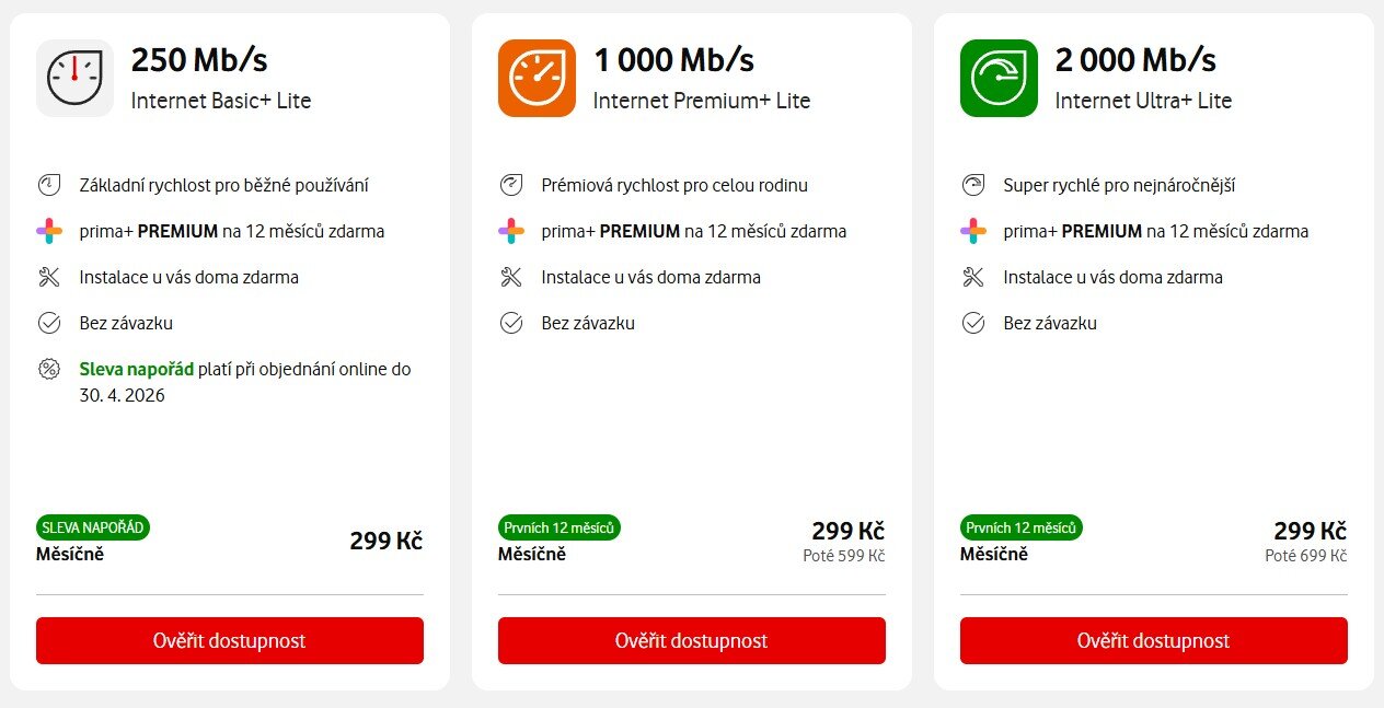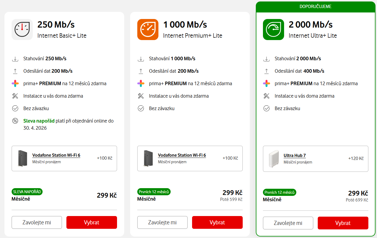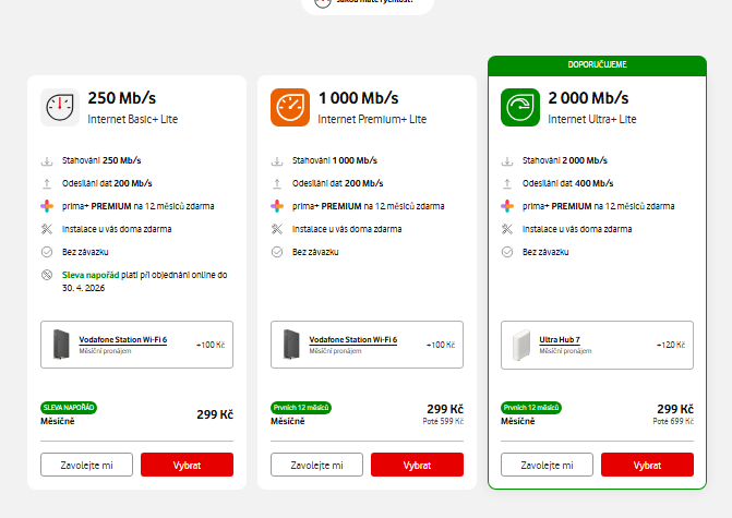 Internet Basic+ (250/200): 136 Kč Modem Vodafone Station 3.1: 70 Kč Celkem: 206 Kč