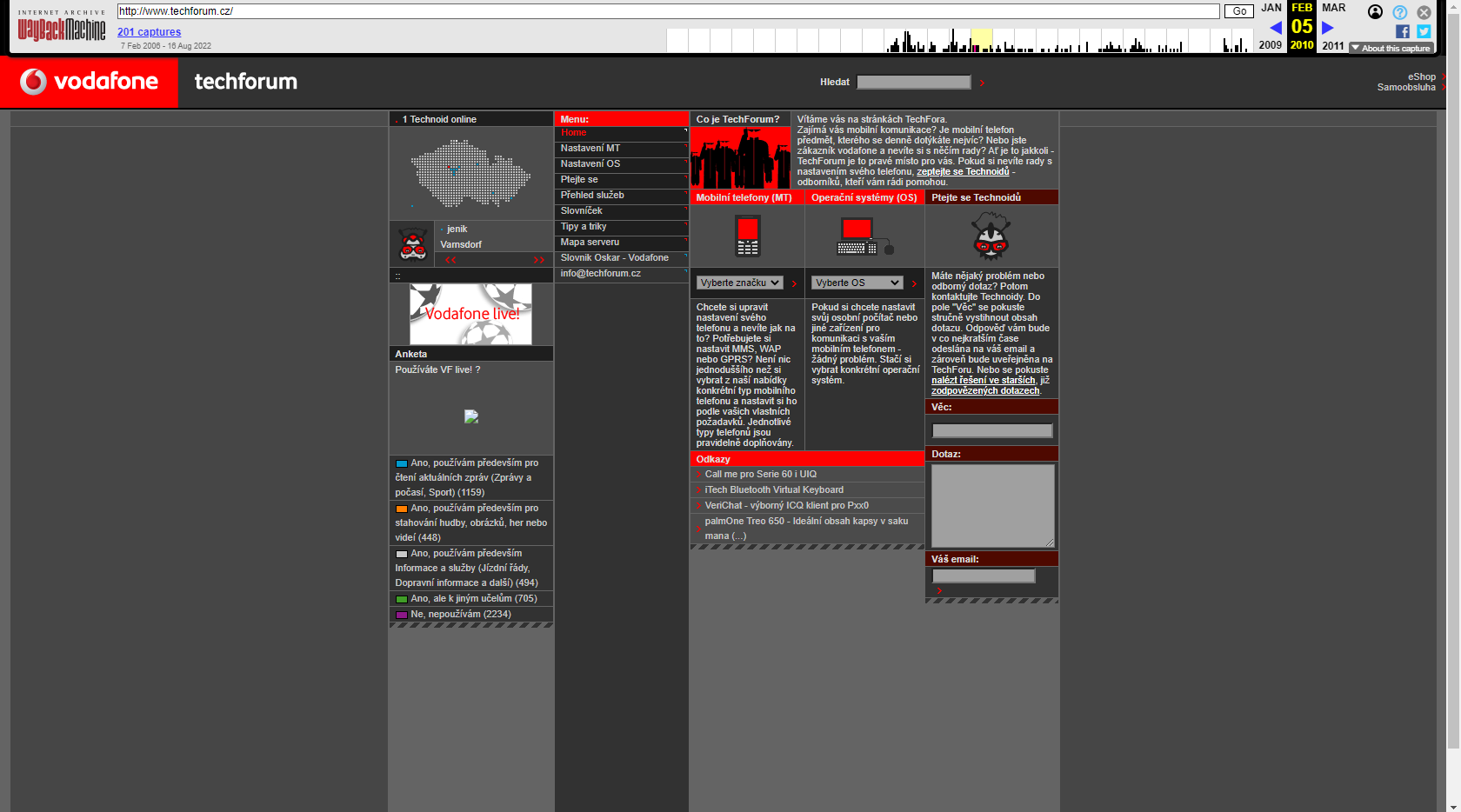 Ahoj, nedávno jsem při průzkumu na Wayback Machine odhalil zajímavou, a dle mého názoru celkem zapomněnou historii domény techforum.cz V době existence UPCzone paralelně existovalo Vodafone Techforum, kde se probíraly témata ohledně mobilního operátora Vodafone. Po fůzi Vodafone a UPC, ale před změnou z UPCzone na Techforum původní Vodafone Techforum úplně zmizelo, a až potom se objevilo, už jako nové upczone. Zajímavé ale je, že příspěvky z Vodafone techfora nejsou na dnešním Techforu dohledatelné, takže nové techforum (exUPCzone) nepřevzalo archiv příspěvků a témat atd... Vodafone Techfora, a to se úplně vytratilo. nakonec screenshoty, a odkazy https://web.archive.org/web/20080417114151/http://www.techforum.cz/ https://web.archive.org/web/20140716010924/http://www.techforum.cz/ https://web.archive.org/web/20161030023440/http://www.techforum.cz/ ... Zajímavé, nebo, aspoň mě to tak příjde.