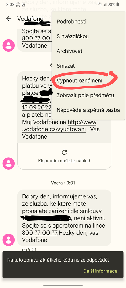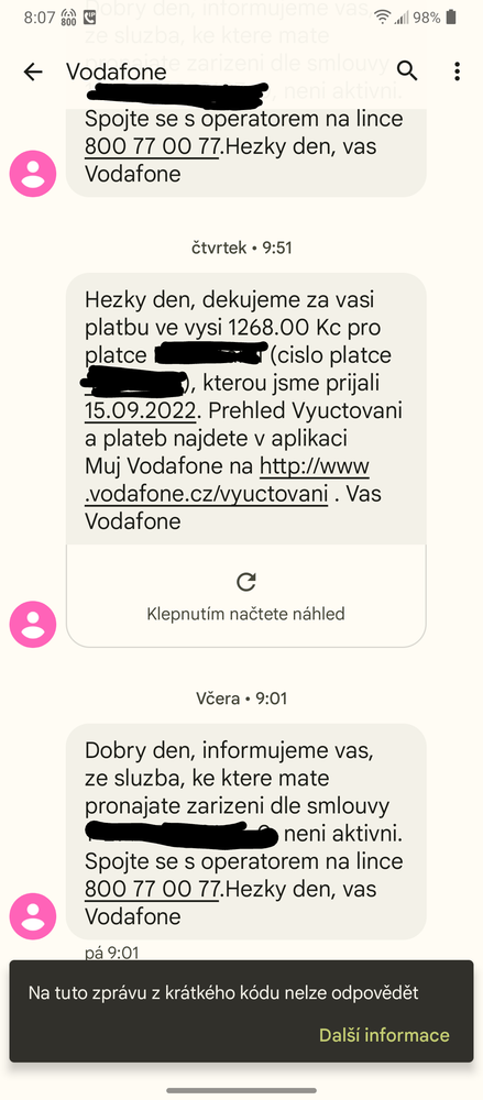 Ahoj, taky tento problém řeším. Jelikož už se tu to řešilo, odkážu tě na minulá témata, jelikož v Sobotu ti asi nikdo z Vodafonu neodpoví : https://www.techforum.cz/topic/61062-sms-zpráva-s-údaji-k-platbě/#comment-454530 a konec článku https://www.techforum.cz/topic/61318-platba-za-služby-vodafone/page/4/#comment-457455 Edit: Aha, nevsiml jsem si, ze toto neni nove tema 🤣 . No nevadi, snad ti odkazy k necemu budou. @Heiko Ahoj, nevim co mas za mobil, ale u me to jde. Viz screenshoty.
