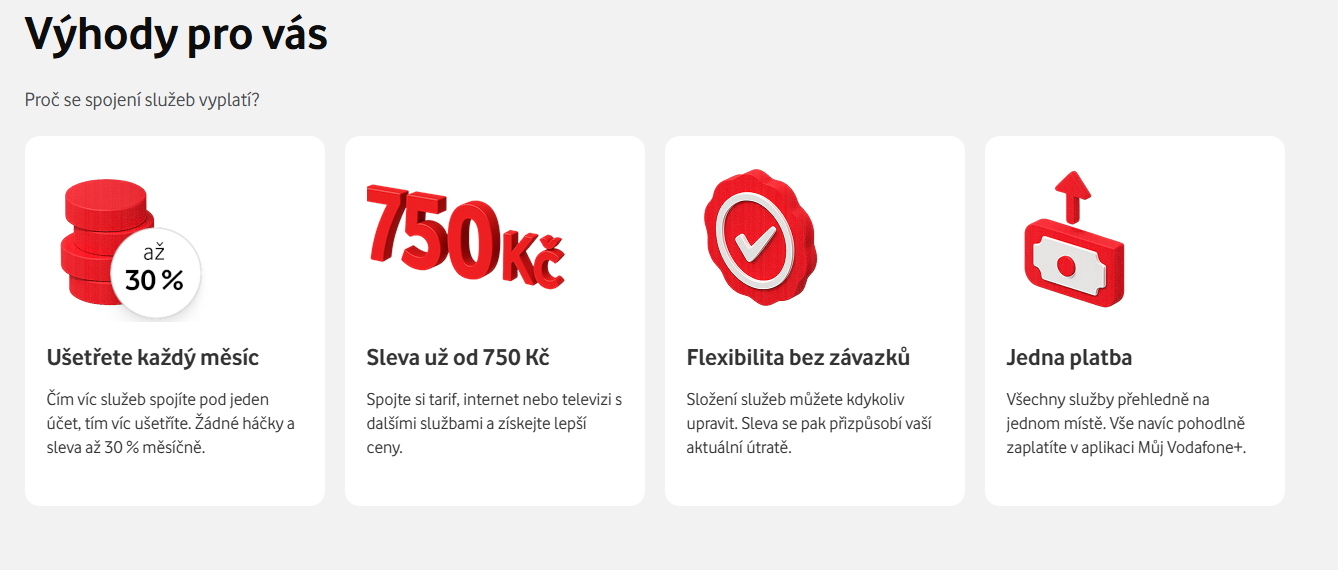12. Tak Vodafone již udělal pro nové tarify slevy při spojení a chovají se tentokrát úplně stejně jako u TMCZ Magenta čím více služeb tím větší sleva 😆 GIGA Kombo – spojte služby u Vodafonu - Vodafone.cz a Podmínky nabídky GIGA Kombo - Vodafone.cz Výše slevy V rámci nabídky zákazník získá jednu ze čtyř úrovní slev v závislosti na celkové částce za paušály (jak je uvedeno výše) v daném zúčtovacím období. Rozhodující je celková částka v daném zúčtovacím období, tzn. v případě změn nastavení služeb v průběhu zúčtovacího období není důležitá ceníková cena služeb aktivních na začátku či na konci zúčtovacího období, ale skutečně vyúčtovaná částka za celé zúčtovací období. Jednotlivé úrovně jsou následující: úroveň slevy Celková částka Sleva na Celkovou částku Bronze 750 Kč a více 15 % Silver 1250 Kč a více 20 % Gold 2000 Kč a více 25 % Platinum 3000 Kč a více 30 %