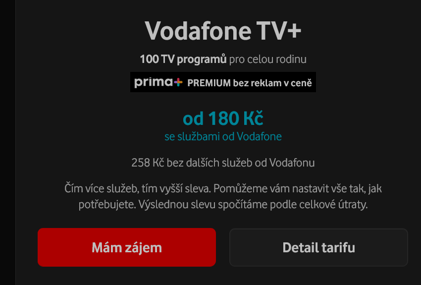 Tak si tam udělejte pořádek..Okopírováno dnes z ofiko stránek - 258 Kč bez dalších služeb od Vodafonu!!! Jinou nabídku tv za jinou cenu nevidím! Nebo si to objednám a pak mi na konci objednávky někdo řekne že cena je jiná? https://www.vodafone.cz/televize/ A co je to - VodafoneTV+ a VodafoneTV? Bylo mi řečeno, že VodafoneTV+ je balíček programů a k tomu Prima+ (proto je tam to + v názvu tarifu) VodafoneTV je balíček bez Primy plus, ale takový balíček se už víc jak rok nedá objednat!!! Nebo kde je v té nabídce na oficiálních stránkách Vodafonu? Můžete mi ho kdokoliv ukázat? A jestli chcete skoro 550 kč za základní balíček i se set top boxem, tak jste se asi zbláznili.