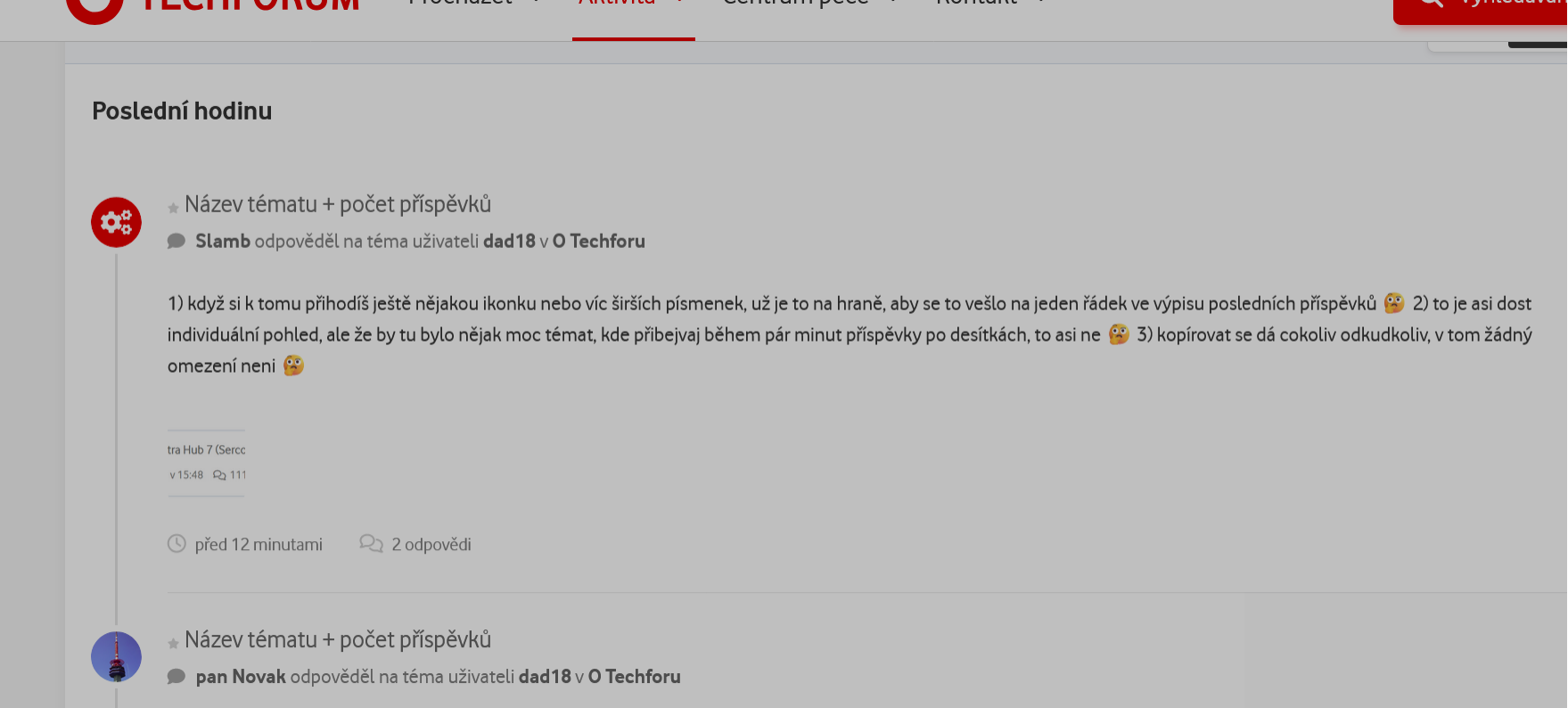 3) Ok, beru, že jsem si mohl s tím citováním víc pohrát. Myslel jsem, že když dám v příspěvku - citovat- a pak to chci vložit do jiného tématu tak dám jen vložit.. ale tohle nefunguje, takže si to ještě musím zkopírovat to citované a pak dát vložit no novém příspěvku. 2) ale jo, je tu občas rozjetá debata na více stran. Šlo mi hlavně o to, že když někdo reaguje na poslední příspěvek tak píše rovnou bez citace a když se ten příspěvek ocitne na další straně tak musím překlikávat na původní aby mi po čase neunikl smysl té odpovědi. 1) jo už to chápu jde ti o tu tabulku, aha, tu vidím poprvé, mám nastaveno aktivity a tam vidím jen nové příspěvky a ty jsou zas každý na jednom řádku.
