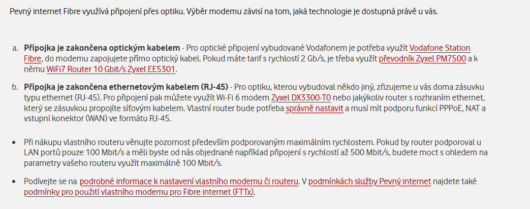 Dobrý den, chtěl bych se zeptat zda bych mohl použít XGZ030 od TP-Linku [https://www.tp-link.com/cz/service-provider/gpon/xgz030/#specifications] jako Bridge k Optickému Připojení od Vodafonu a za to si Zapojit Mikrotika ? Mám vybudovanou Optickou Zásuvku od Infotelu na síti Vodafone / T-Mobile Když Terminál splňuje minimální požadavky dle : https://www.vodafone.cz/_sys_/FileStorage/download/3/2229/pozadavky-na-zarizeni-fttx.pdf Aktuálně mám od Vodafonu jejich : Modem Vodafone Station Fibre Který když si přepnu do režimu Bridge tak na něm neustále Bliká Červeně dioda u položky Internet (když jsou v nastavení vypnuté stavy LED, když se zapnout tak svítí bíle ale v pozadí bliká červeně) a když se modem přepne do režimu router tak nebliká dioda a svítí pouze bíle. Když jsem zkoušel jak dodaným Modem vzládá tarif 500/500 tak sem si všiml že má hop pinku z 9ms klidně na 300ms