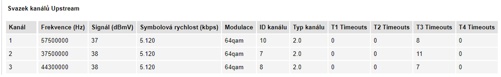 Odesláno 27. února 2023 2 roky US je upstream, tedy upload, vidím tam naladěné 3 kanály, což mě přijde málo, obvykle jich bývá 4 až 6, takže možná má modem problém s naladěním zbylých kanálů, u downstreamu to na žádný problém nevypadá, chybovost by mohla být nižší, ale není to nic tragického. Kabel 150 Mb/s - Komfort Compal VF, VTV box, CA modul Brno