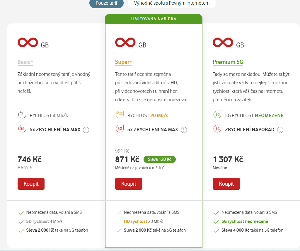 Odesláno 1. června 2023 2 roky V 12. 6. 2022 v 11:12, kautskym napsal: tady máte lepší tarify, Vodafone nabízí klientům, kteří mají jen internet levnější neomezený basic a neomezený premium 5G než je standardní nabídka a dokonce i tyto tarify nabízí ale pouze v kombinaci s pevným internetem 😕 🙂 tak přidávám aktualizovanou nabídku pro klienty, kteří mají pouze internet od Vodafone a odkaz stále stejný https://www.vodafone.cz/tarify/kombi/ Premium+, Super DSL Super, Red Basic Lite Základní, ALLinONE Vodafone Station WiFi 6, Vodafone TV app, Vodafone TV Play box, Zyxel VMG8623 Praha, Nová Ves
