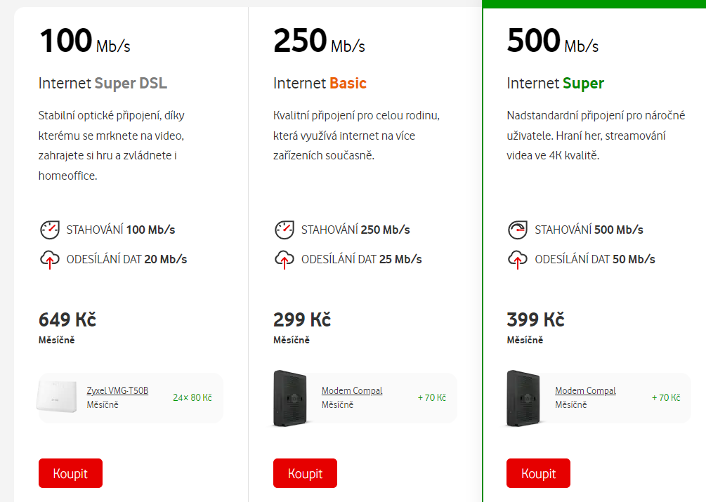 Dokonce naopak ještě někde zobrazuje i nížší rychlosti za vyšší ceny, konkrétně Internet Super DSL 100/20 za 649 Kč bez modemu