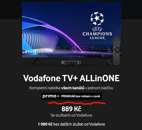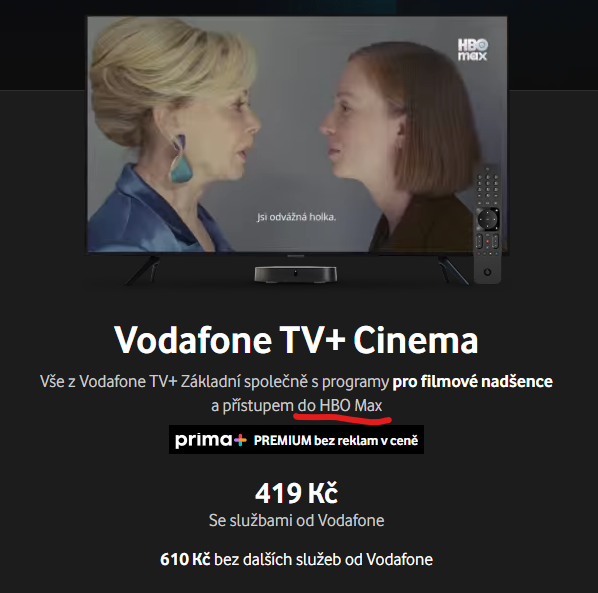 Odesláno před 3 hodinami3 hod By mohl být i aktuální popisek služeb Vodafone televize na webu.U ALLinOne se o žádném HBO Max neinformuje, jen o Prima+ PremiumU Vodafone TV+ vč Cinema ano. Premium+ - Základní Vodafone Station WiFi 6, Vodafone TV app Praha
