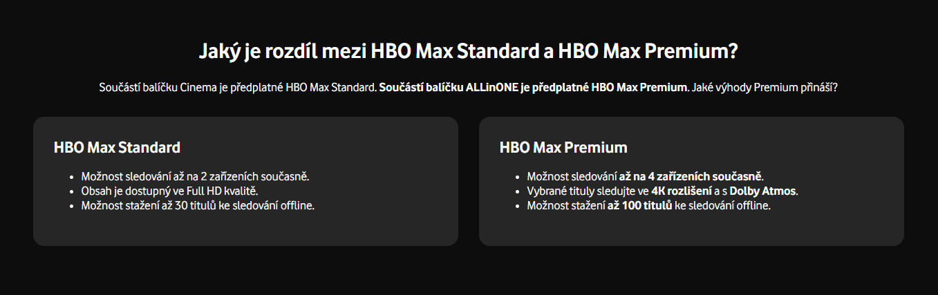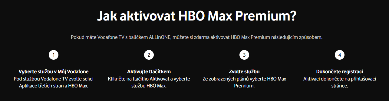 Odesláno před 3 hodinami3 hod @Technikus přesně tak viz stránka k TV https://www.vodafone.cz/televize/hbo-max/Jsem stávající zákazník s HBO Max Standard. Jak přejdu na HBO Max Premium?Pod službou Vodafone TV v samoobsluze Můj Vodafone zvolte sekci Aplikace třetích stran a HBO Max. Pokud máte nárok na předplatné HBO Max Premium, uvidíte ho v nabídce za 0 Kč.Je součástí předplatného HBO Max Premium i balíček HBO Sport?Ne, sportovní balíček součástí prémiového předplatného není.Jak si aktivuji předplatné aplikace HBO Max ve Vodafone TV?V rámci Vodafone TV si předplaťte balíček Cinema nebo výhodnou nabídku ALLinONE. V ceně balíčku Cinema získáte předplatné HBO Max Standard a v rámci balíčku ALLinONE předplatné HBO Max Premium. Aktivaci předplatného provedete v samoobsluze Můj Vodafone. Více informací o předplatném a jeho aktivaci najdete v našem Centru péče a také na oficiálním webu HBO Max. Premium+, Super DSL Super, Red Basic Lite Základní, ALLinONE Vodafone Station WiFi 6, Vodafone TV app, Vodafone TV Standard box, Vodafone TV Play box, Zyxel VMG8623 Praha, Nová Ves